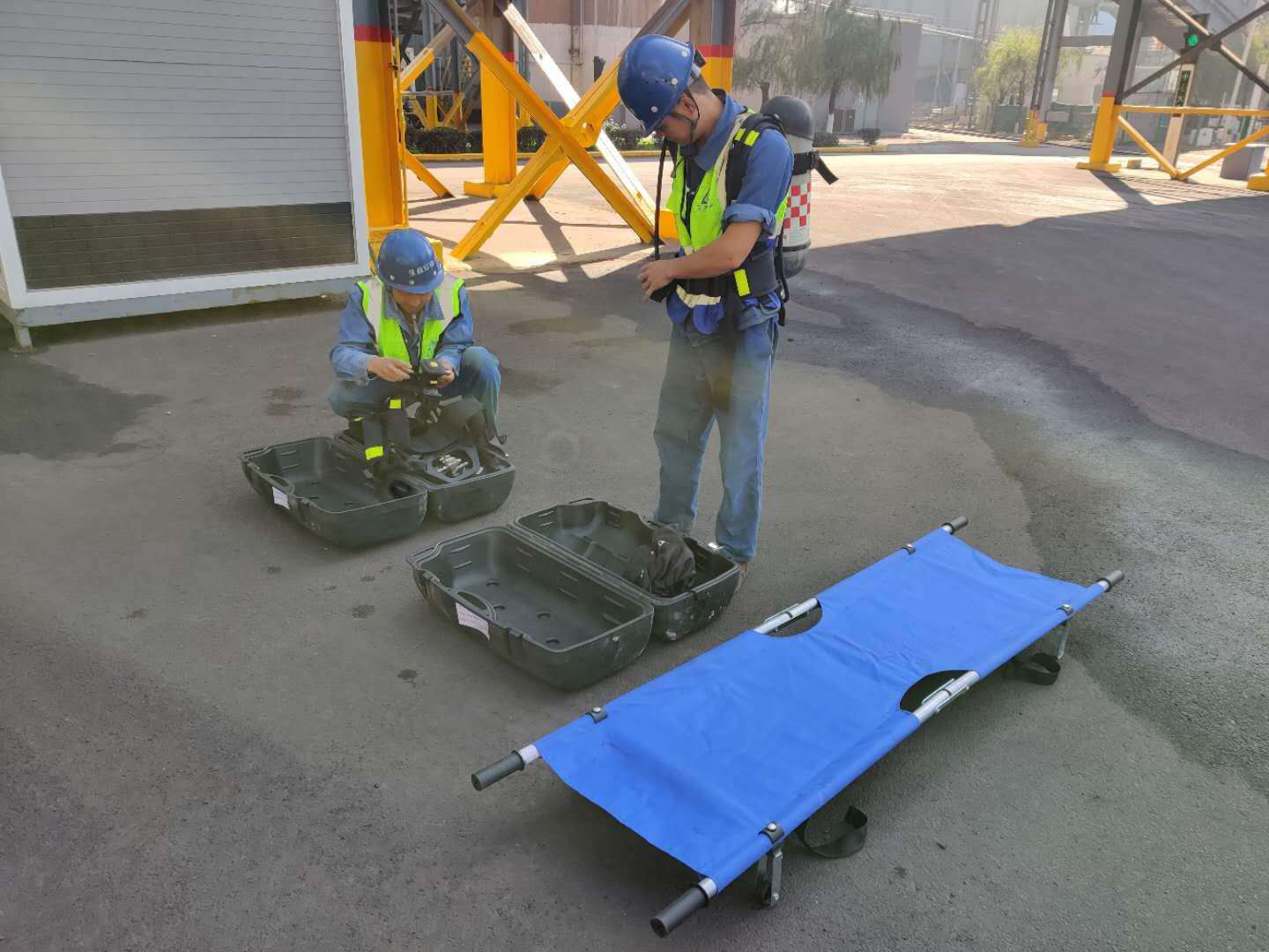 本次演練背景是200現(xiàn)場巡檢發(fā)現(xiàn)熱風爐區(qū)域煤氣濃度達到300PPM,發(fā)生人員中毒,并匯報中控、班長,中控立即匯報鐵廠調度,班長到現(xiàn)場檢查設備情況并協(xié)調處理,并將情況匯報生產部部長,班長通知現(xiàn)場操作人員立即將空氣呼吸器和急救物資拿到現(xiàn)場,同時安排人員疏散周邊人員,并做好周邊區(qū)域警戒。