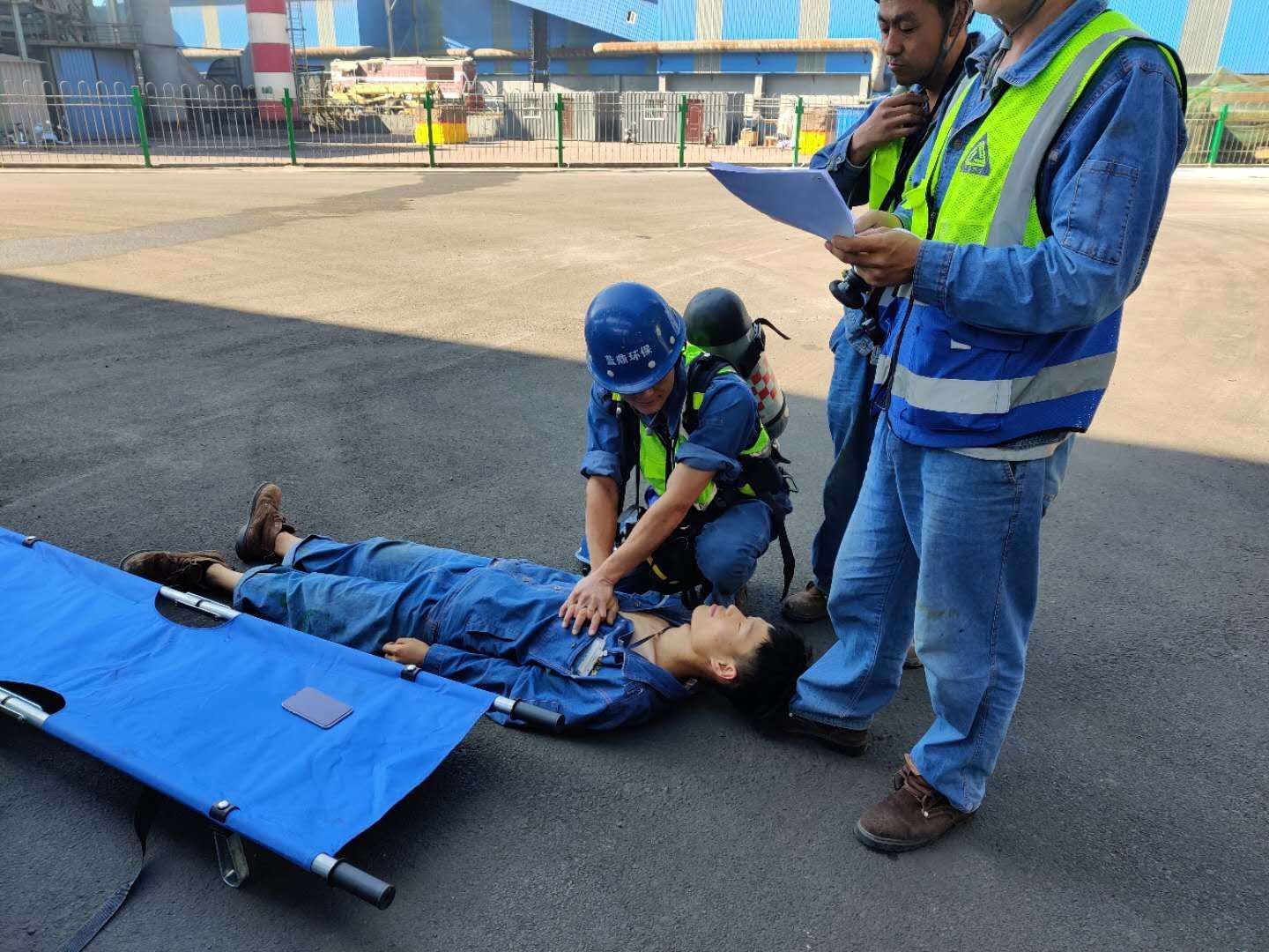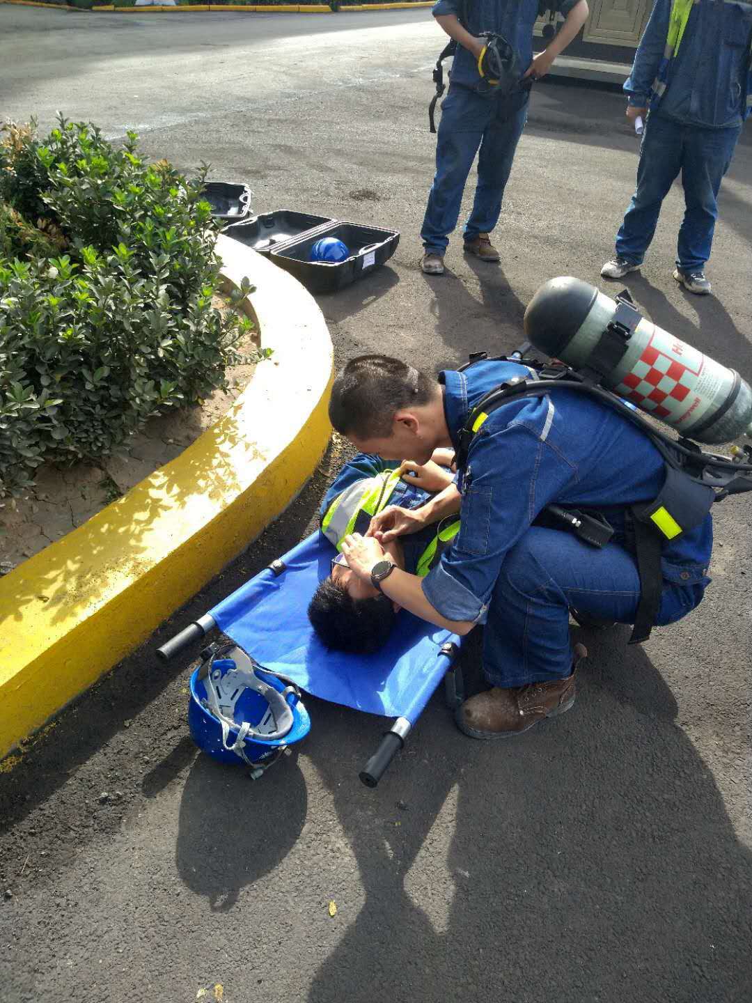 班長立即組織現(xiàn)場兩名崗位人員參與急救,攜帶煤氣報警儀和擔架,背上空氣呼吸器進入煤氣區(qū)域,并迅速利用擔架將中毒人員抬到安全區(qū)域,進行心肺復蘇、人工呼吸,并聯(lián)系救護車進行下一步急救。