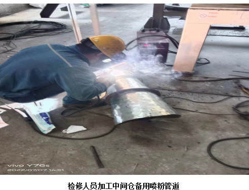 7月7日10:30分在生產(chǎn)丙班做好相關(guān)準(zhǔn)備工作后,檢修班組員在中間倉開始在線技改,開孔加裝一根備用下料管道。在經(jīng)過七小時的辛苦工作后,備用下料管道順利完成。下料管道不僅可以備用,還可以在進(jìn)口SO2過高時,啟動后增加下料量,提高脫硫效率,實現(xiàn)一舉兩得!